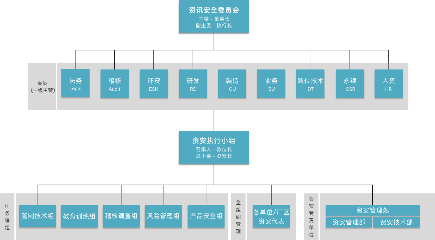 资讯安全委员会为世界杯下单平台网站官网资安最高管理组织,向董事长报告。下辖资安执行小组负责推行资讯安全委员会之各项决议。为持续建构完整且精实的资安专 责团队,资讯安全管理处下成立「资讯安全管理部」与「资讯安全技术部」,持续投入资源以强化团队资安核心能力。