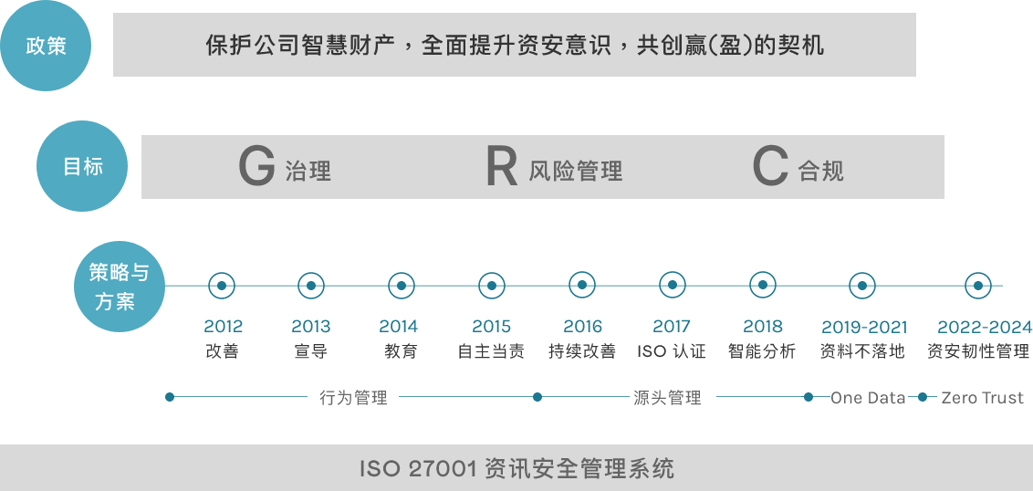 世界杯下单平台网站官网每年订定执行资安策略及行动方案,透过延续性的方案及考量内外部关注议题,于全公司范围展开实施全新行动以符合资讯安全管理系统 ISO27001,并制定关键指标监督,透过PDCA循环改善,以期逐年降低资安风险及提高公司资安成熟度。