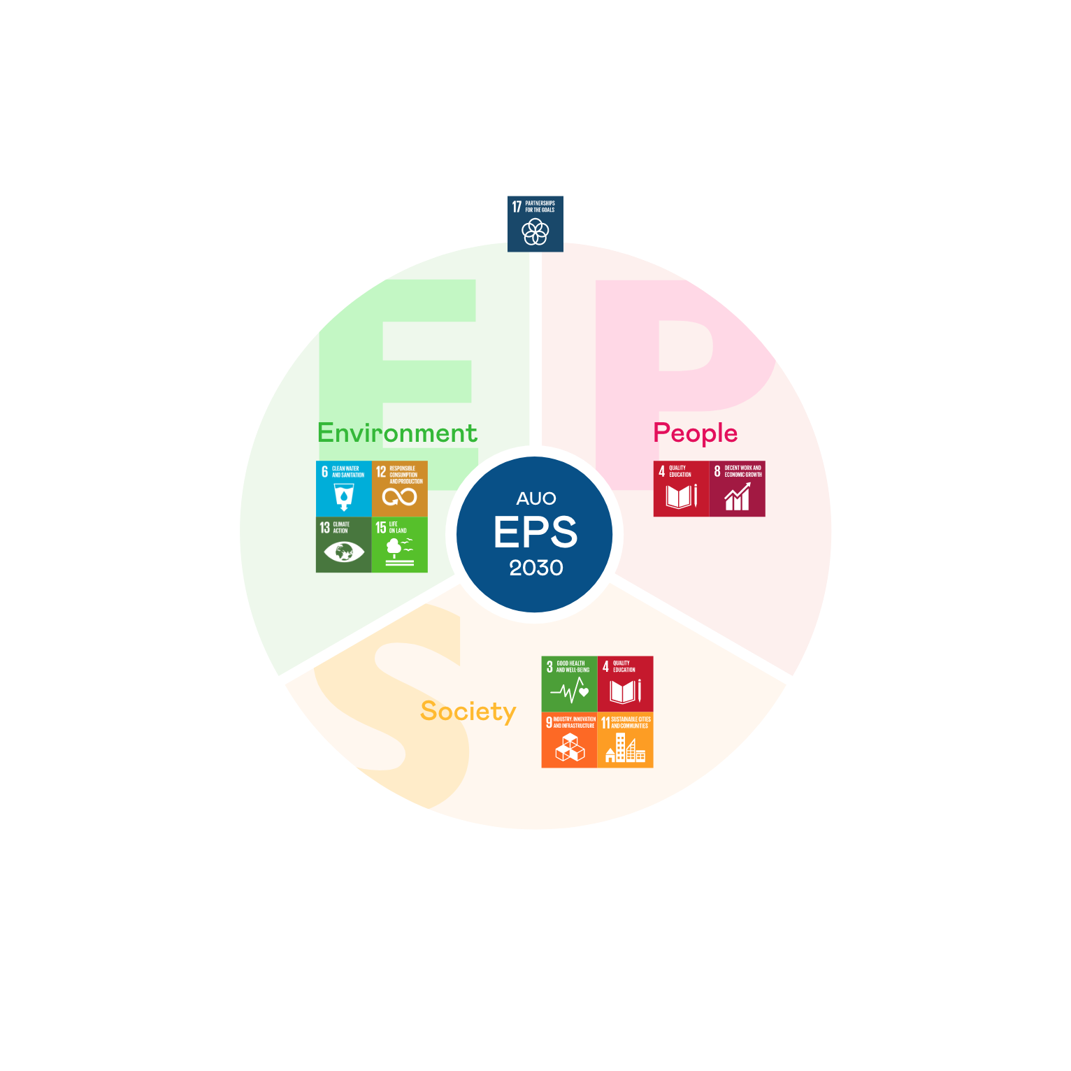 Aligned with the United Nations SDGs, AUO embraces the vision of “Go Beyond CSR, Create Shared Values.” Guided by this vision, we have established the three major pillars of our EPS Sustainability Framework and developed actionable targets that shape our corporate sustainability roadmap.