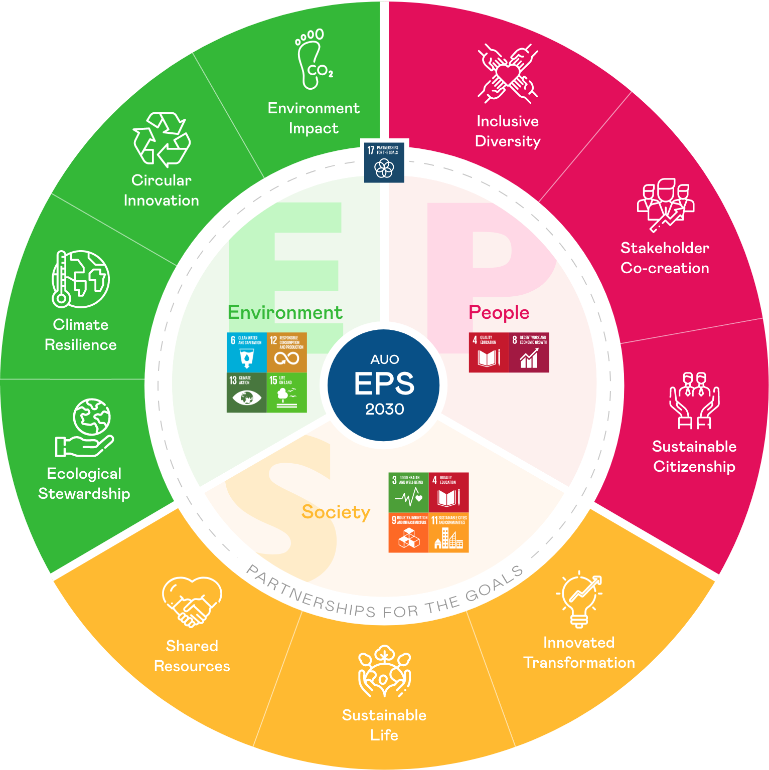 Building on EPS performance from 2018 to 2025, AUO has set 30 sustainability goals under the EPS 2030 outlook to guide our long‑term efforts. We remain committed to reducing environmental impact, promoting circular economy practices, and strengthening our positive social influence. Through continuous innovation and collaboration with ecosystem partners, we aim to expand scenario‑based applications and create new possibilities for sustainable growth.